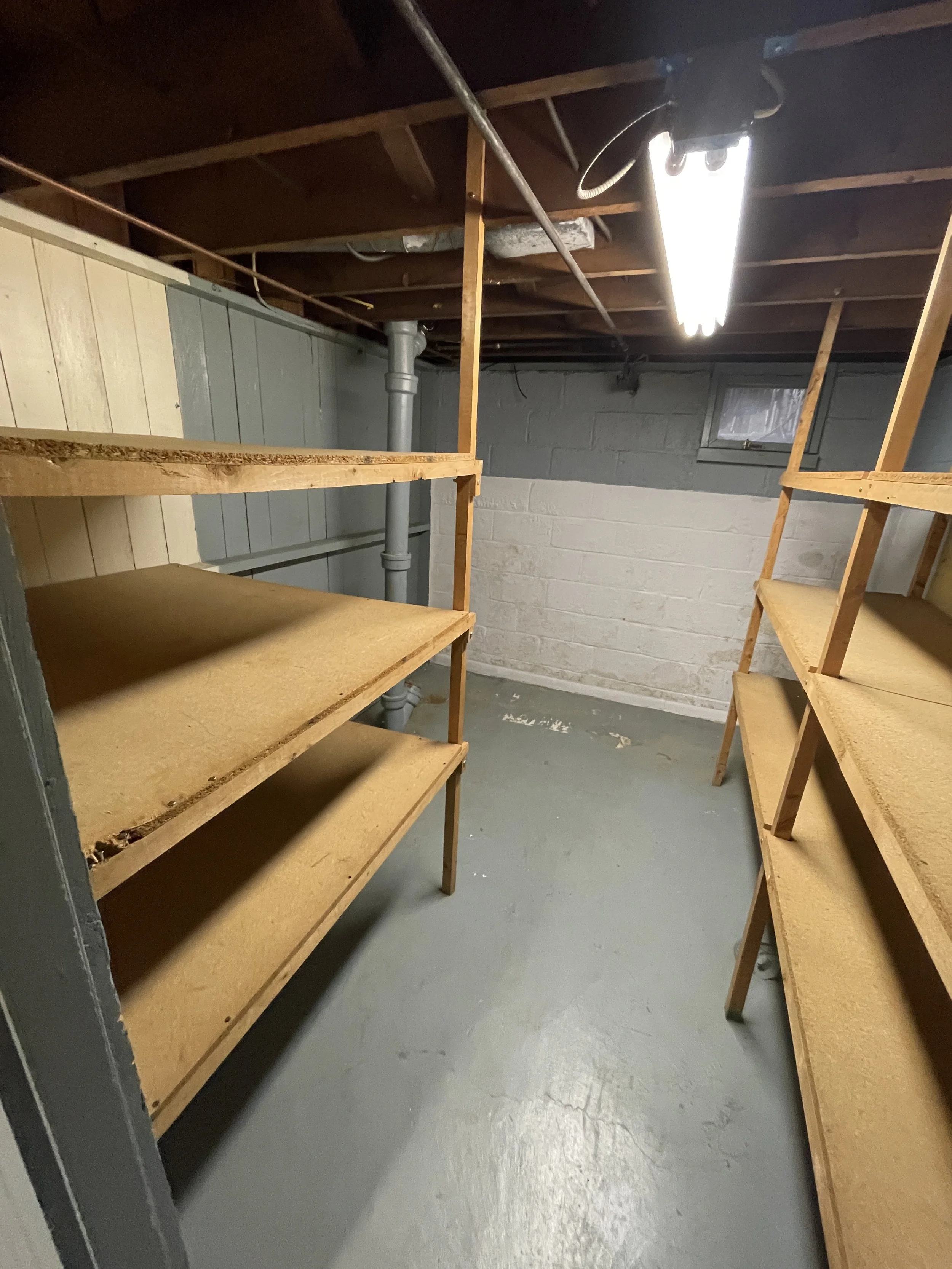 The original layout consisted of one large room that housed laundry and the HVAC system. There was one room off this main that held large open shelves for storage.