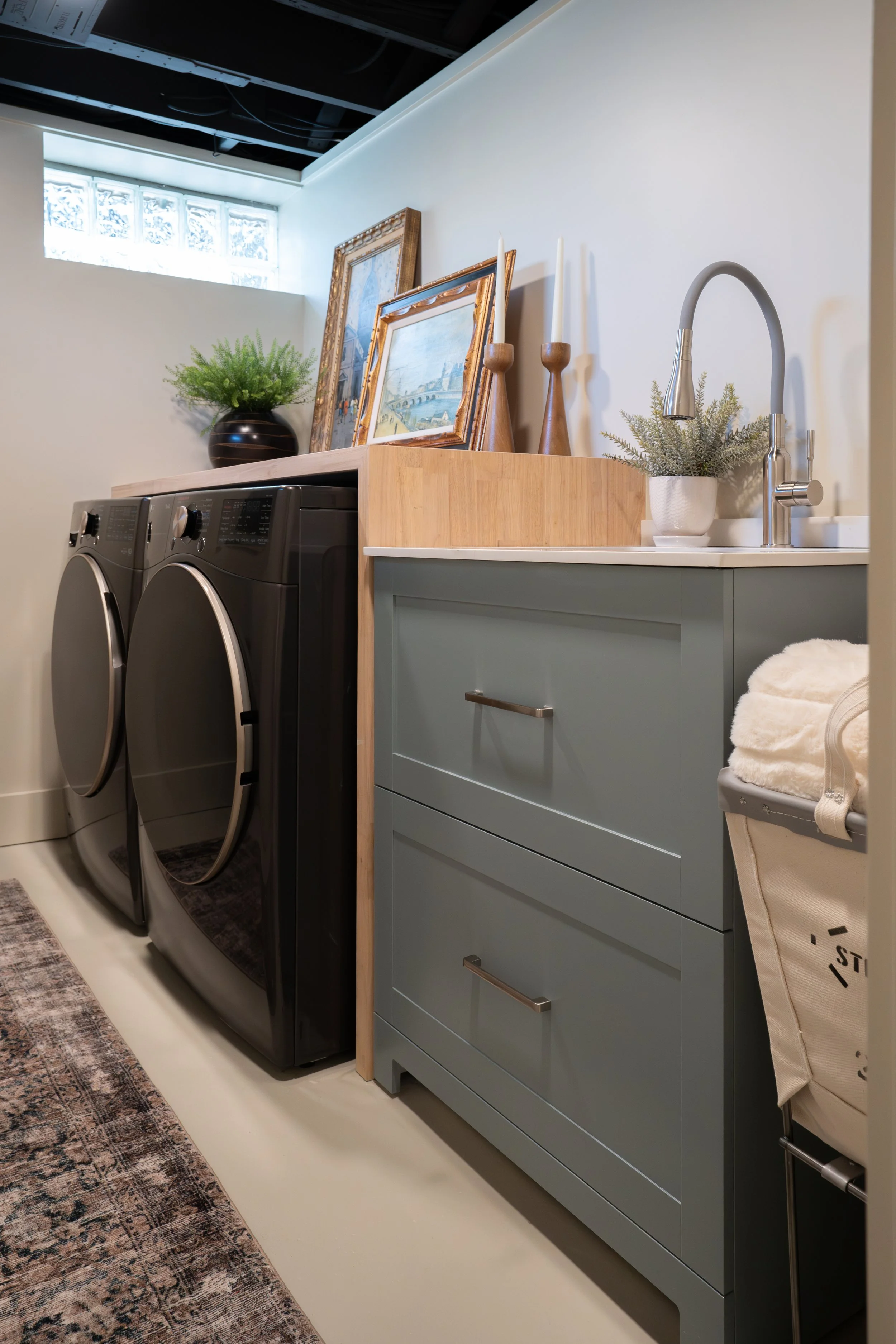 The laundry is a very minimal space, which was intentional, but still feels elevated when it pulls all the colors together from the rest of the space. Additionally, a custom countertop over the washing machines creates a more functional area to fold and sort clothing.