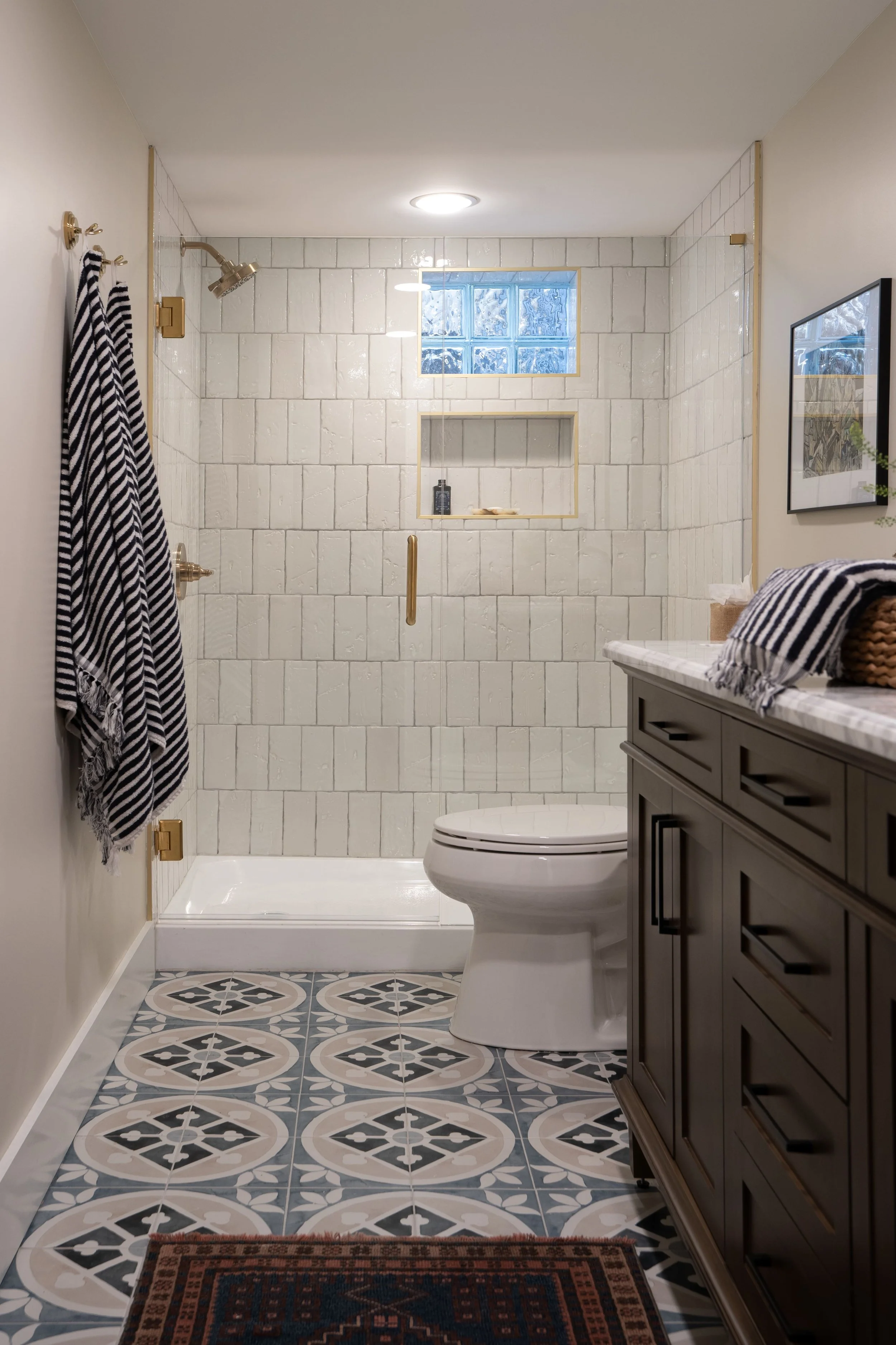 Last, the addition of a comfortably-sized full bathroom makes this space truly feel like it could be part of the above ground space. Similar to all other areas, no detail was an afterthought. Warm tones were pulled in through the interesting detail in the floor tile and brass finishes, complimented by the rich stain of the vanity and shower tile.