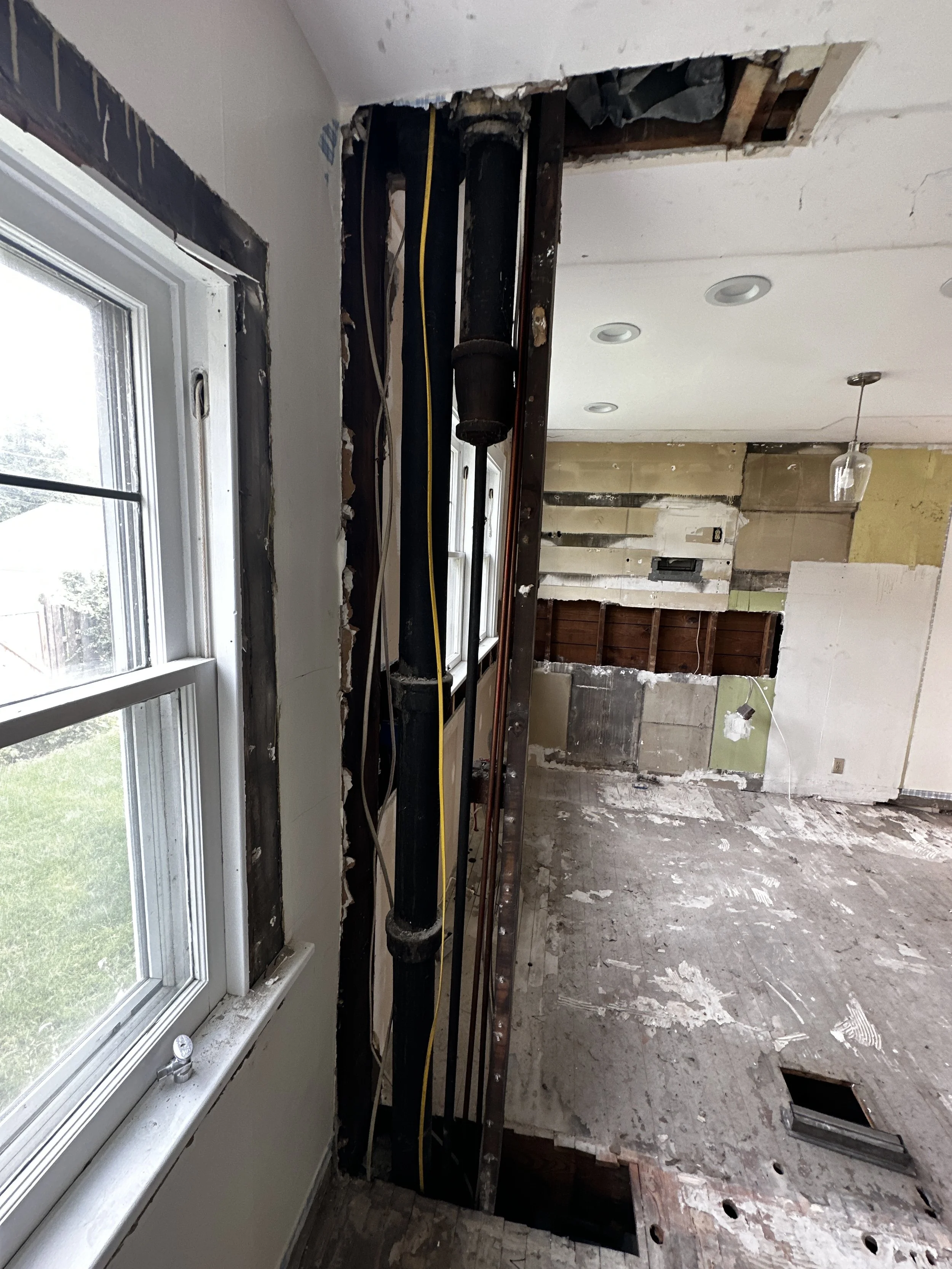 Not surprisingly, as is common in older homes, our team came across an unforeseen challenge to work through when the room was taken down to the studs. That challenge came in the form of a large plumbing stack that ran through the wall connecting the second floor plumbing all the way into the basement.